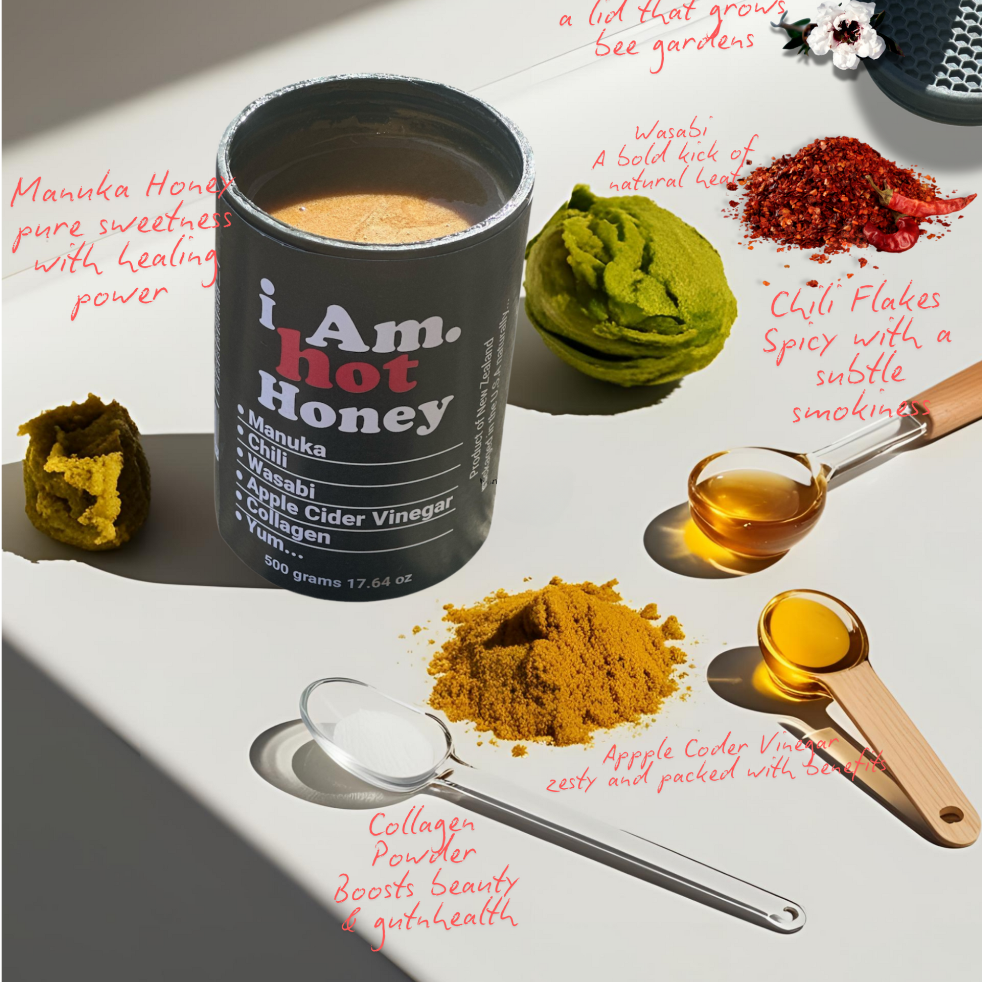 Dripping with premium MGO-rated Manuka honey, sourced from the untouched landscapes of New Zealand, I Am Hot Honey is anything but ordinary. The heat builds with a bold blend of chilli and wasabi extract, while black garlic brings a deep, umami richness that lingers on the palate. A splash of apple cider vinegar sharpens the edge, balancing the sweetness with a gentle tang.